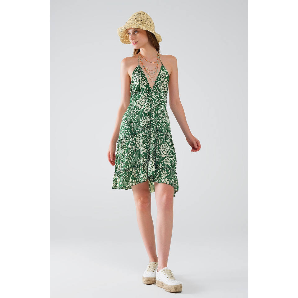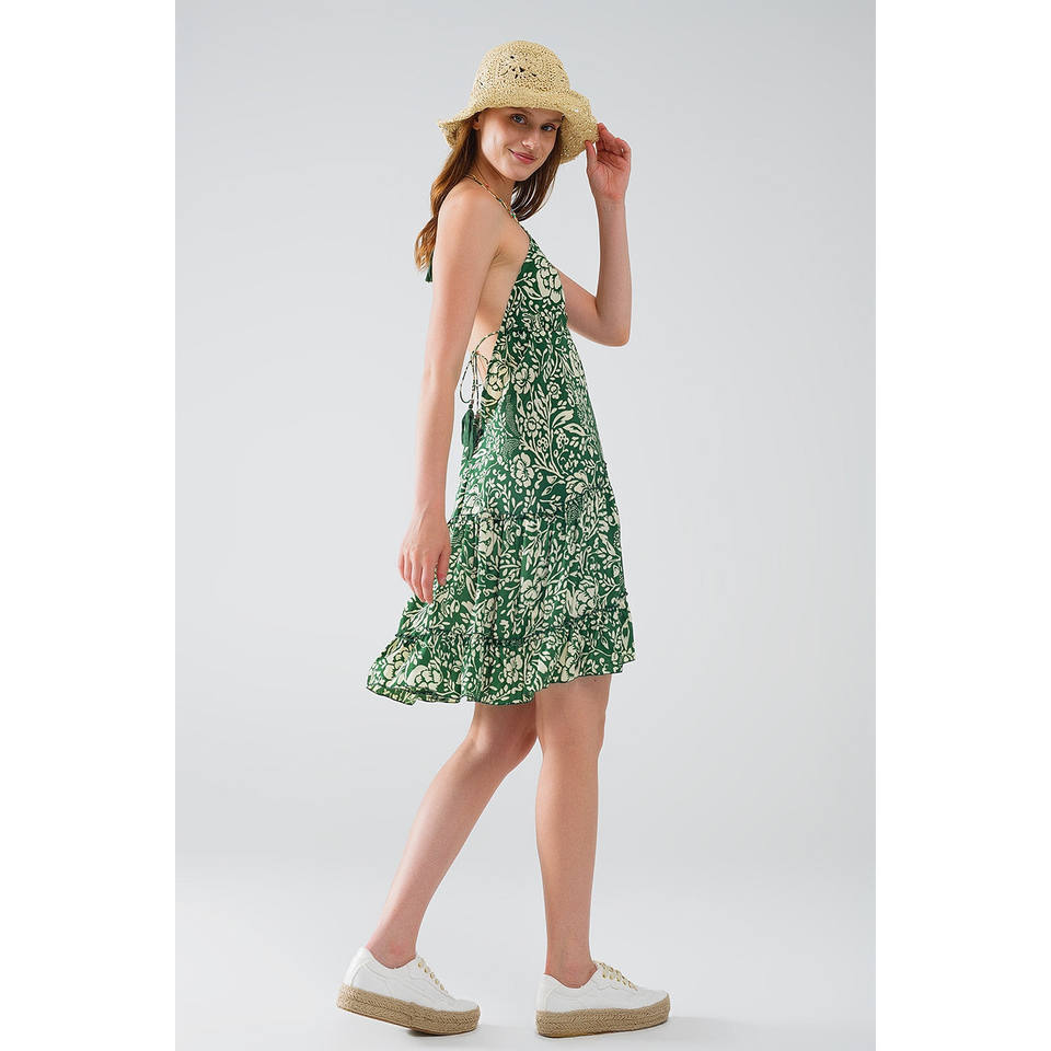 Vestido Corto Verde Estilo Boho con Estampado Floral de Satén