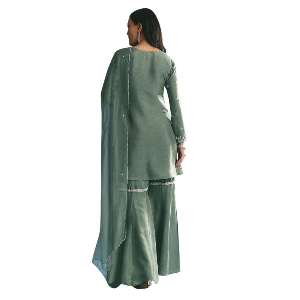 Juego de Kurta de seda verde con Moti y Cutdana Sharara para ropa festiva al por mayor, eventos culturales, recepciones de bodas y pedidos a granel