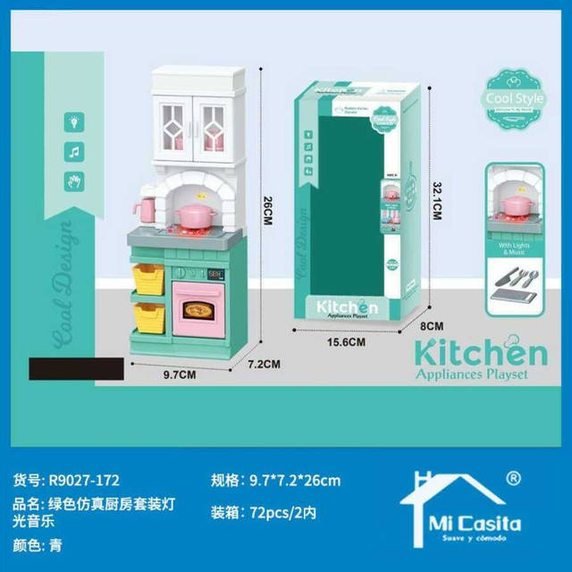 Juguetes de cocina de madera de simulación verde, luz y música con 3 baterías AG13, 72 Uds./cartón para juego de simulación