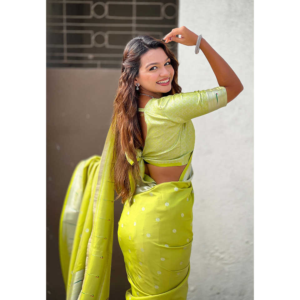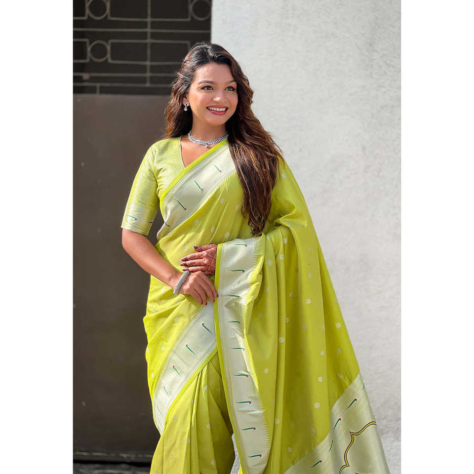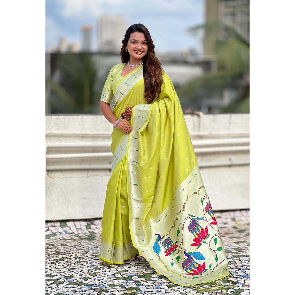 Sari de Seda Paithani con Lazo de Pavo Real y Loto Tejido con Hilo Verde, Ropa India y Pakistaní
