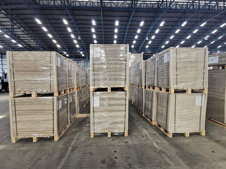 Tablero de cartón gris, compuesto en hojas para diferentes tipos de cajas de embalaje