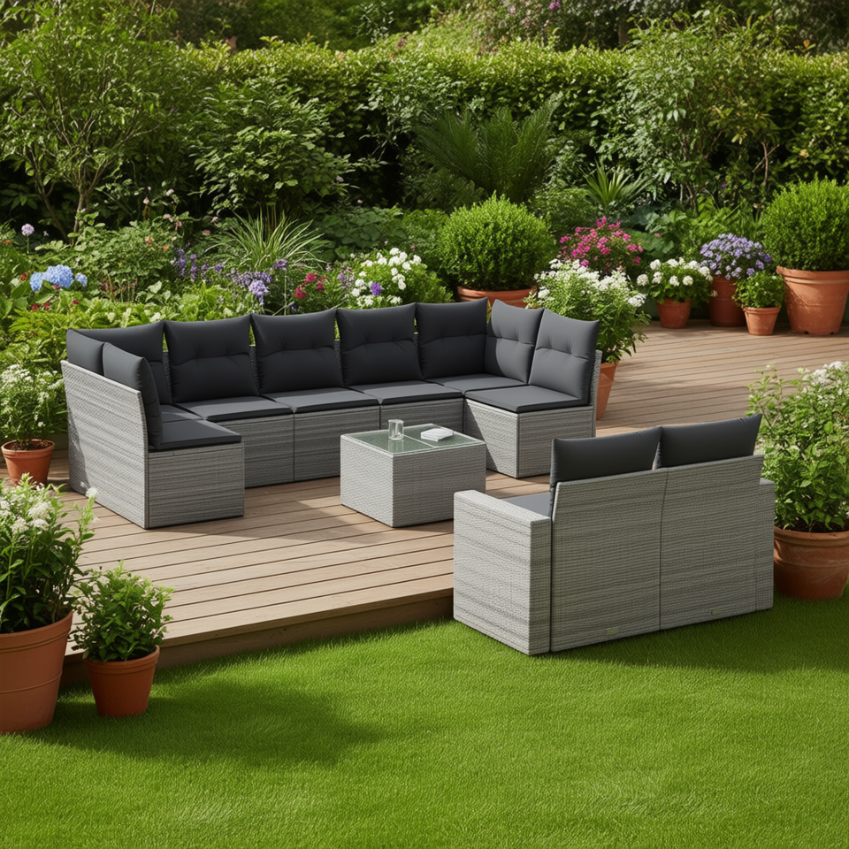 Conjunto de Sofá de Jardín de Ratán Gris con Vidrio Templado, Muebles de Exterior para 6 Personas, Diseño Contemporáneo