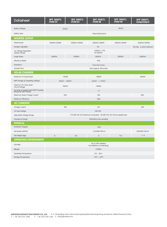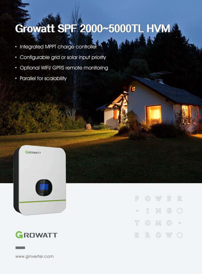 Inversor Solar Growatt Off-Grid SPF 2000-5000TL HVM/LVM 5kw Plus Onda Sinusoidal Pura con Sistema Todo en Uno de Inversor y Batería