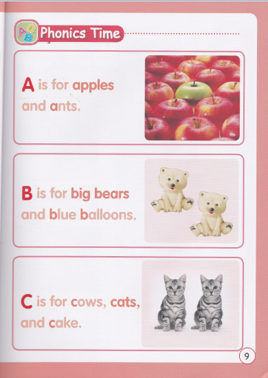 Book Content:letters,phonics,conversation,song,word,sentencee