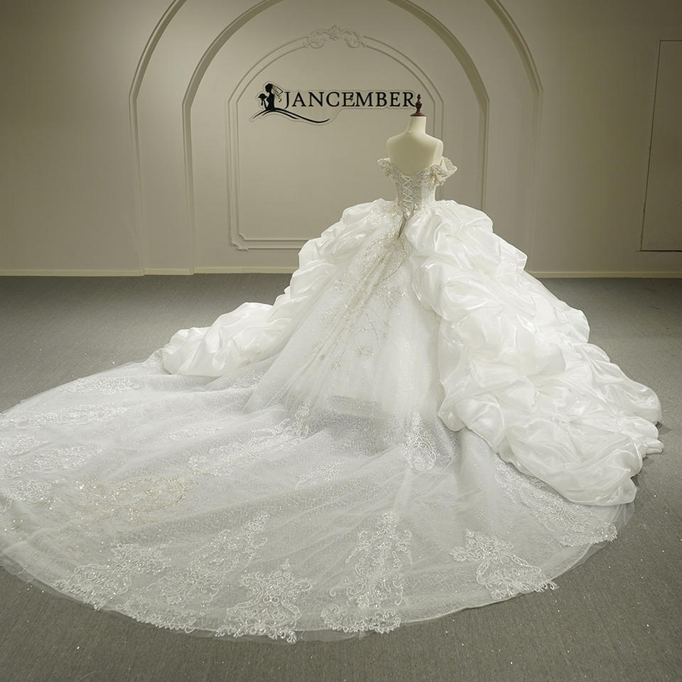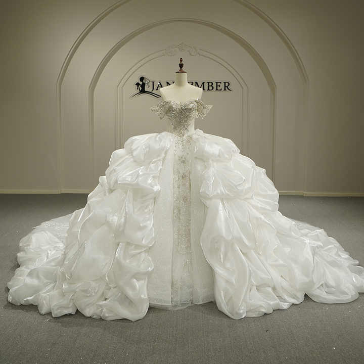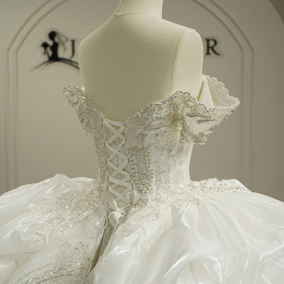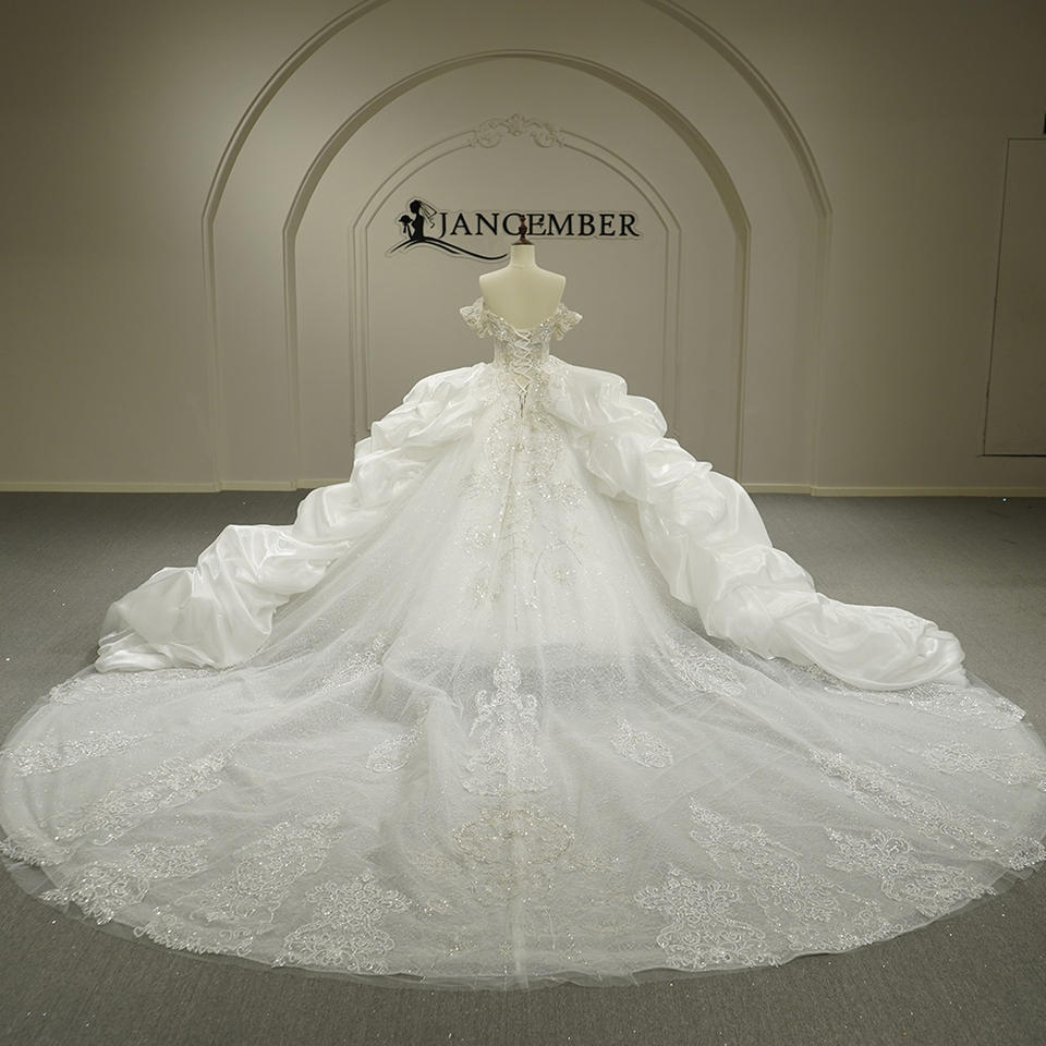 Gt26056 Vestidos de Novia de Lujo Hechos a Mano, Modernos, con Hombros Descubiertos, Volantes, Cordones, Cola de Capilla y Apliques para Mujer