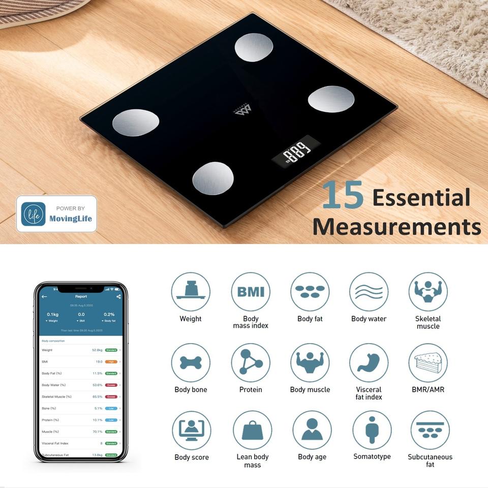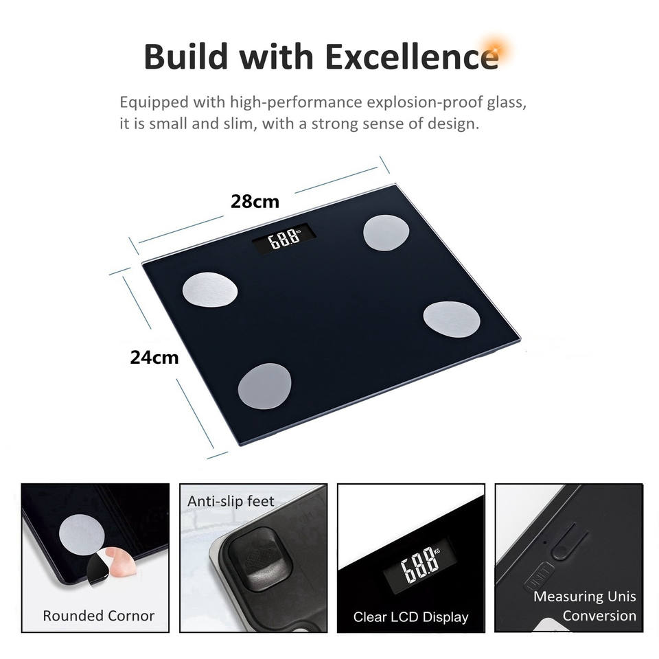Báscula de grasa corporal con pantalla grande de fábrica de Guangdong, báscula de baño Digital inteligente de tamaño compacto, báscula de Control de salud con aplicación gratuita