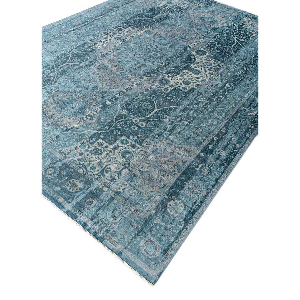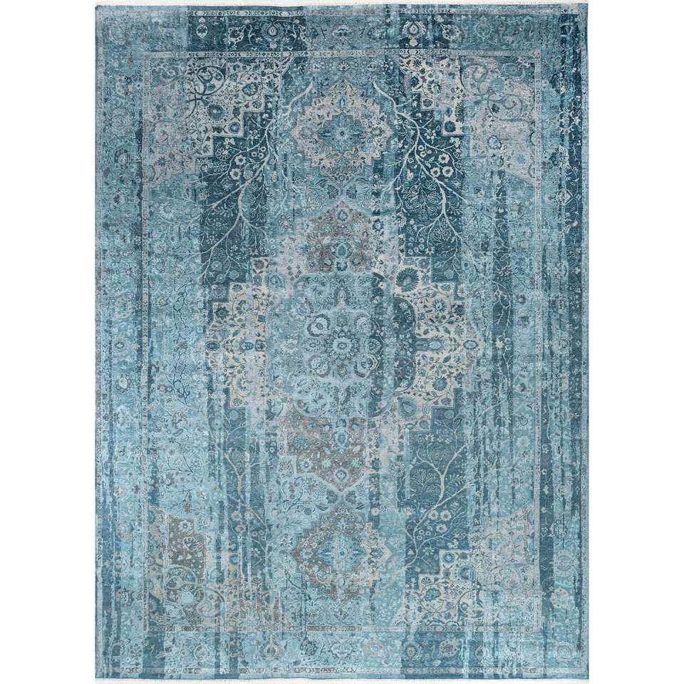 Alfombras de Seda Anudadas a Mano Gulmarg con Patrón de Medallón Azul para Decoración de Sala de Estar, Alfombra Rectangular de 9x12 para Pasillo, Patchwork Skps-217