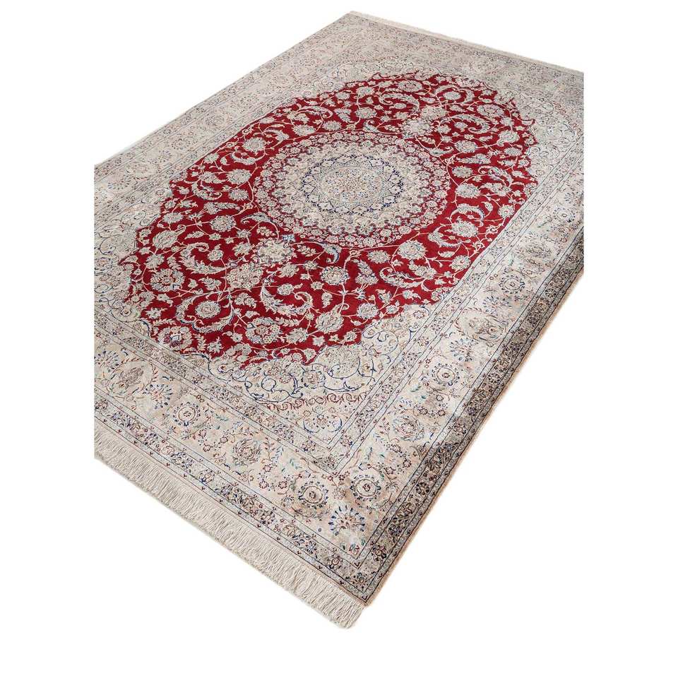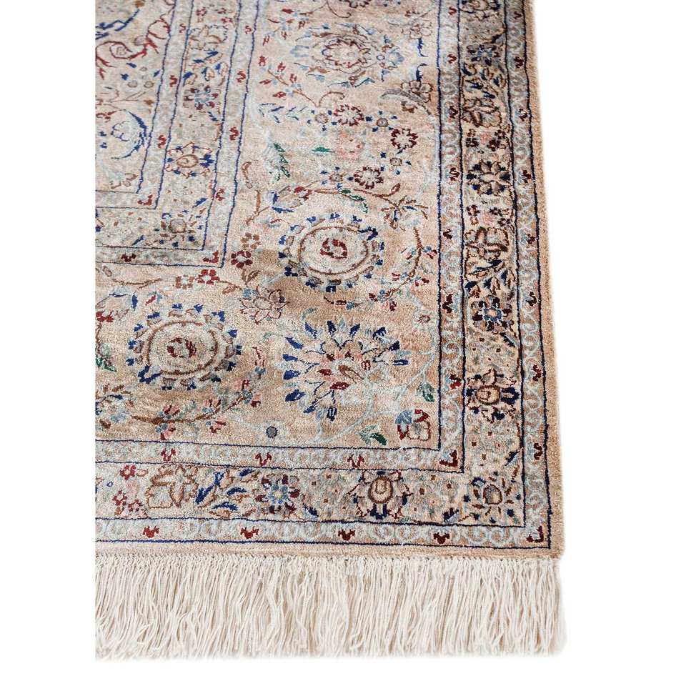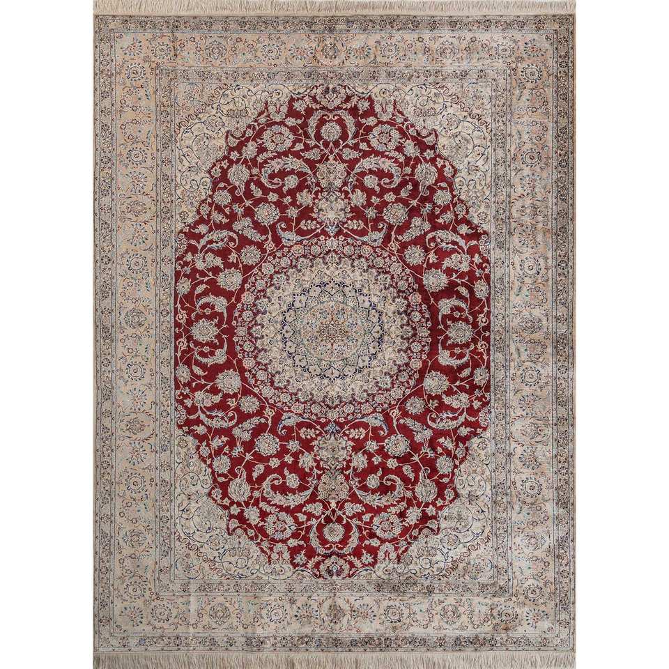 Alfombra de Seda Anudada a Mano Gulmarg, Grande, Rectangular, con Medallón Rojo Naranja, Modelo Pae-6297, para Pasillo o Sala de Estar