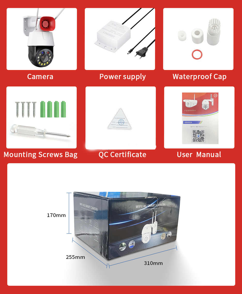 Características especiales:Giro e inclinación, Visión nocturna, De Audio de dos vías, Humanos de seguimiento de movimiento, Detección de movimiento, Impermeable / a prueba de mal tiempo