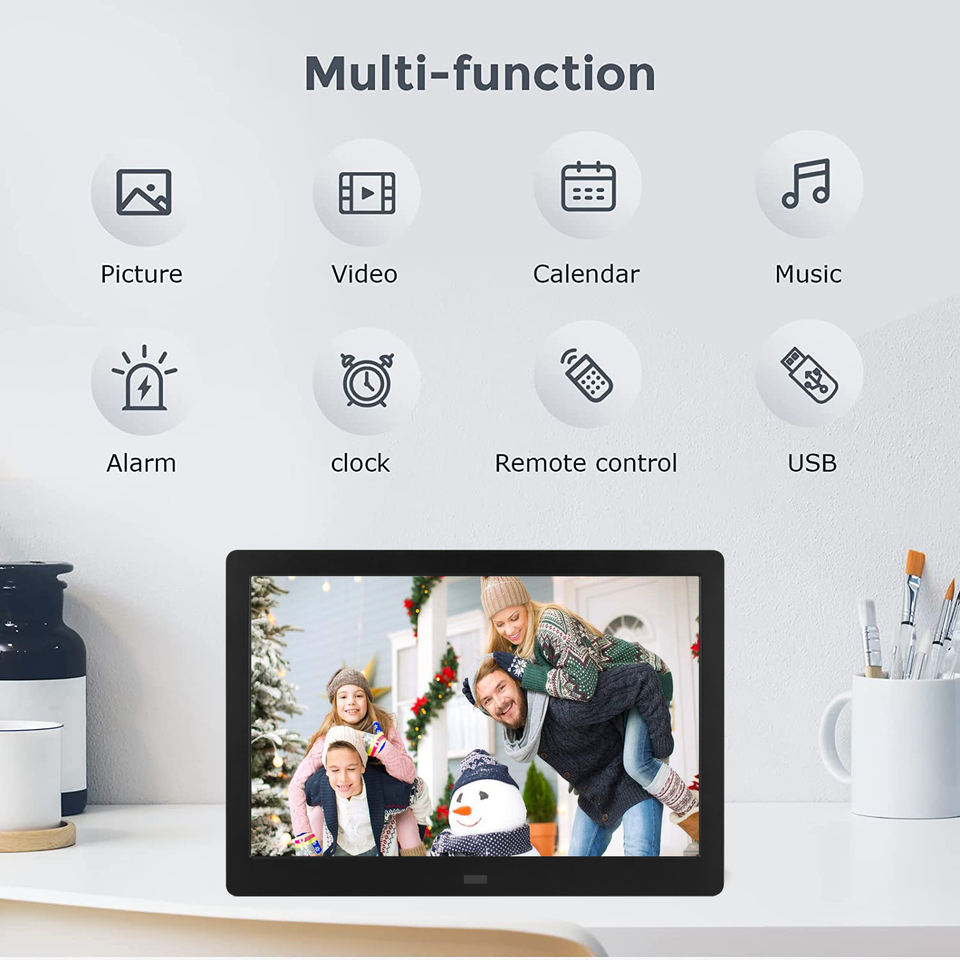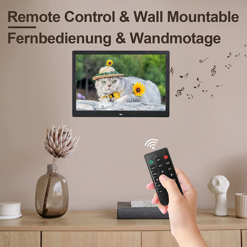 Marco de Fotos Digital con Pantalla HD IPS de 12.1 Pulgadas, 16 GB de Almacenamiento, Reloj y Control Remoto con Reproductor MP3 - Regalo para Familiares y Amigos