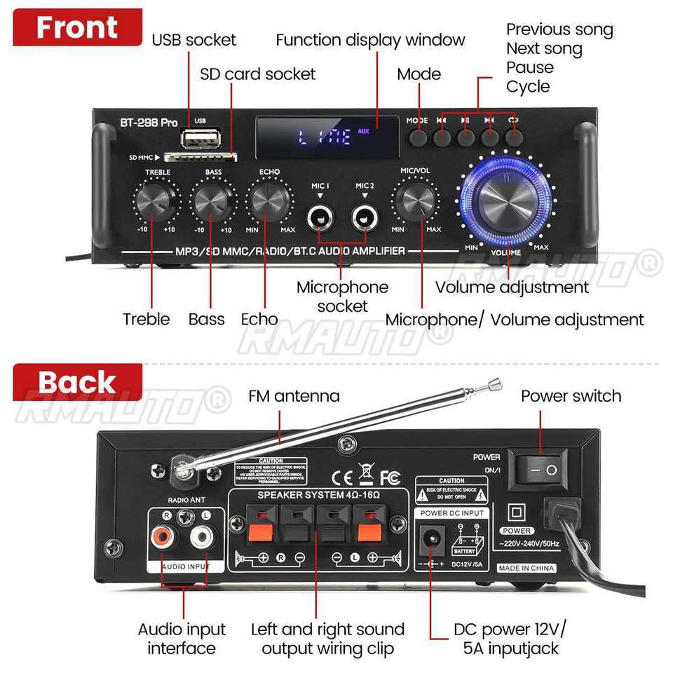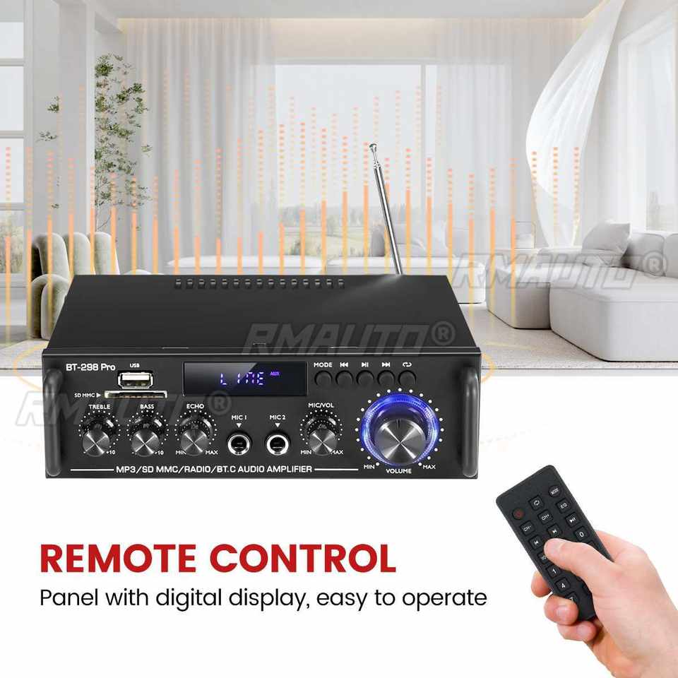 Amplificador de Potencia HIFI de 2.0 Canales, Amplificador de Audio Digital Bluetooth, 12V 240V, Compatible con Bluetooth, USB, SD, Radio, con Control Remoto, UE