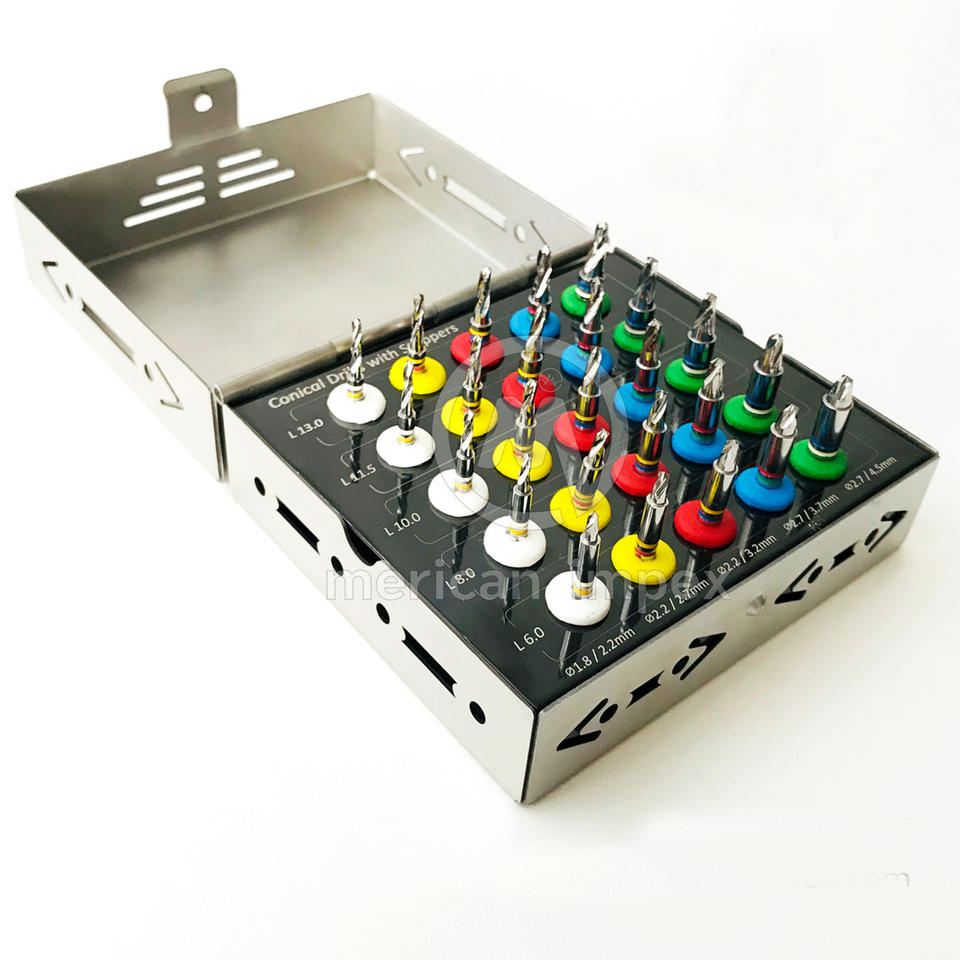 Nombre:KIT DE TALADRO CÓNICO DE IMPLANTES DENTALES DE ALTA CALIDAD 25 PIEZAS CON TAPÓN
