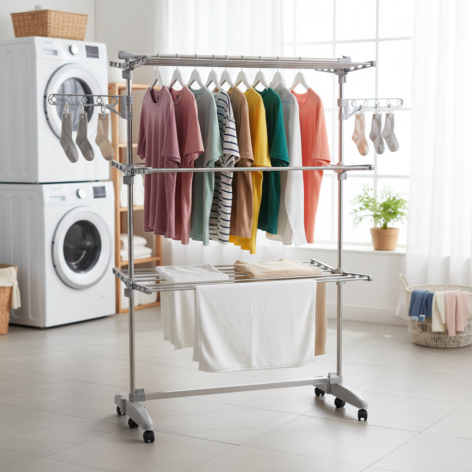 Foldable structure, 6 tier vertical design, Large drying capacity, Rolling wheels with lock, Space saving storage, Stable metal frame, Easy to move and use