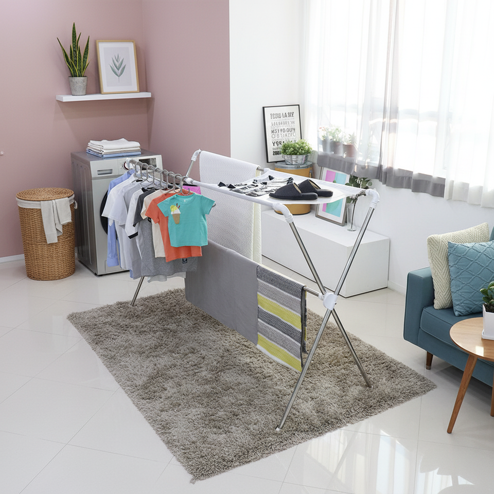 Foldable design, X shaped stable frame, Space saving structure, Lightweight and portable, Wide drying area, Easy setup and storage, Indoor laundry use