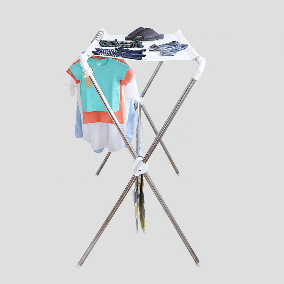 Foldable design, X shaped stable frame, Space saving structure, Lightweight and portable, Wide drying area, Easy setup and storage, Indoor laundry use