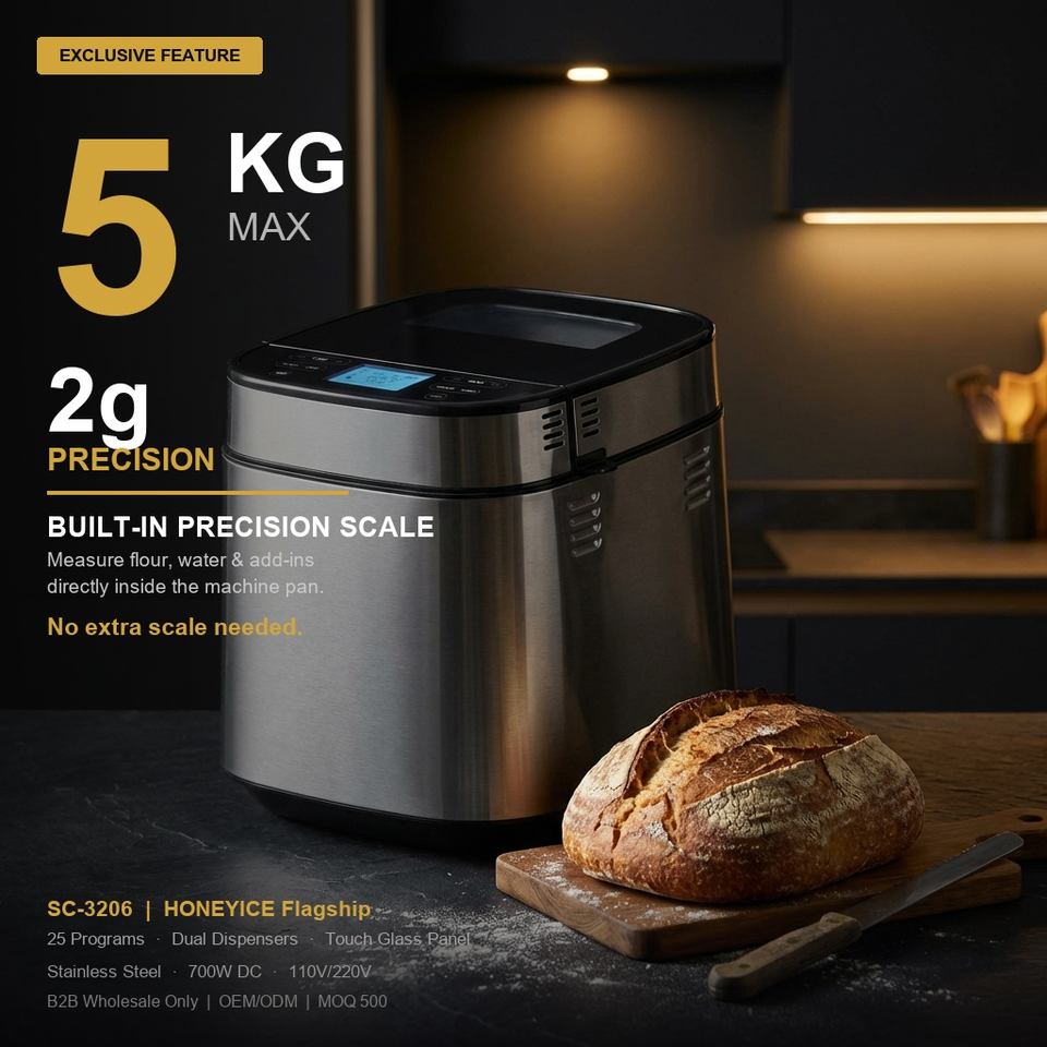 HONEYICE Máquina para Hacer Pan Eléctrica Inteligente con Báscula de Precisión Integrada 2g-5kg, Dispensador Automático Doble de Levadura y Frutos Secos, Pantalla Táctil Completa, Uso Doméstico