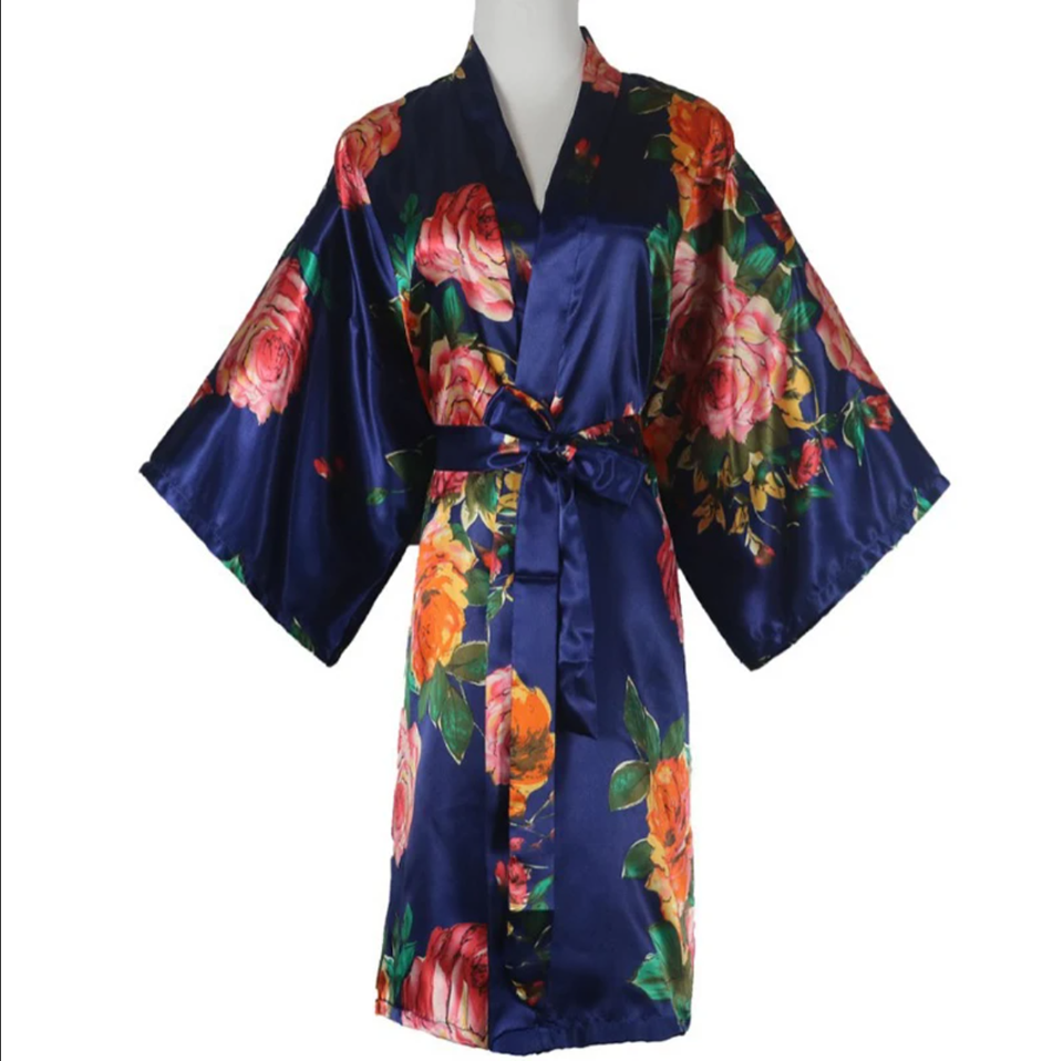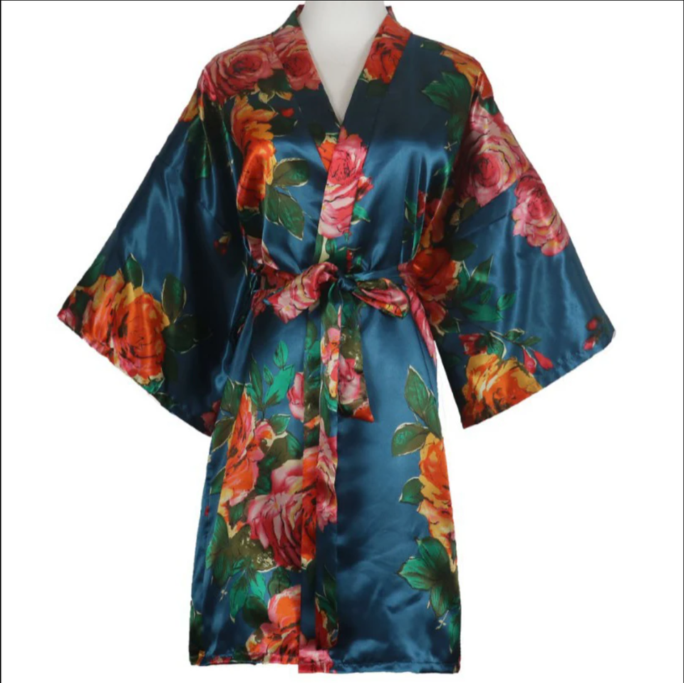 Bata de Novia de Satén con Estampado Floral, Kimono Corto, Bata de Dormir, Conjunto de Pijama, Ropa de Estar por Casa, Bata Elegante para Mujer