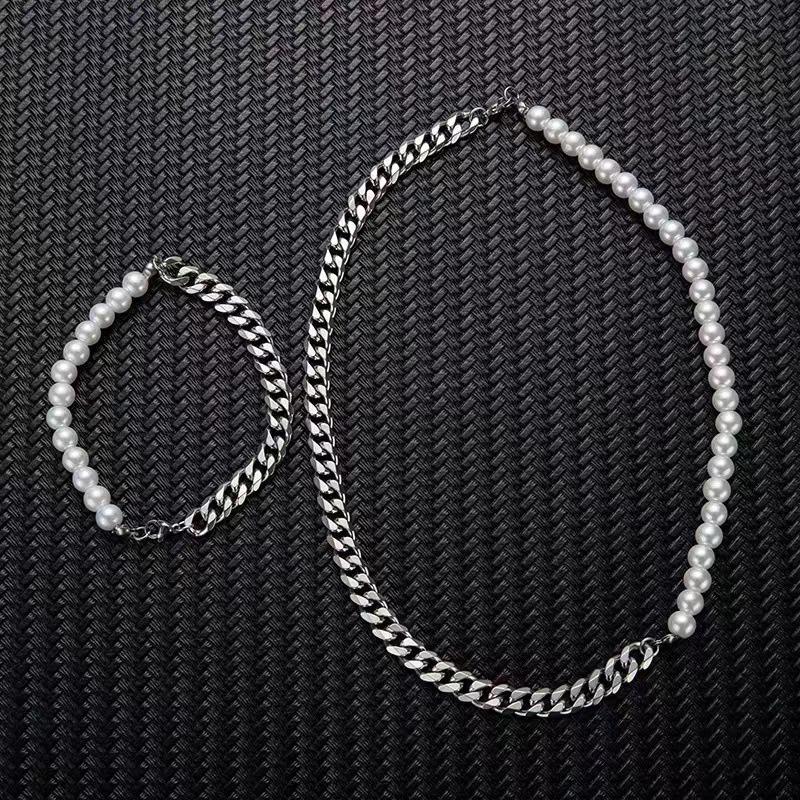 HOVANCI, joyería impermeable para hombre, cadena de medio Figaro cubano de acero inoxidable, cuentas de perlas de concha blanca, collar de perlas para hombre, pulsera
