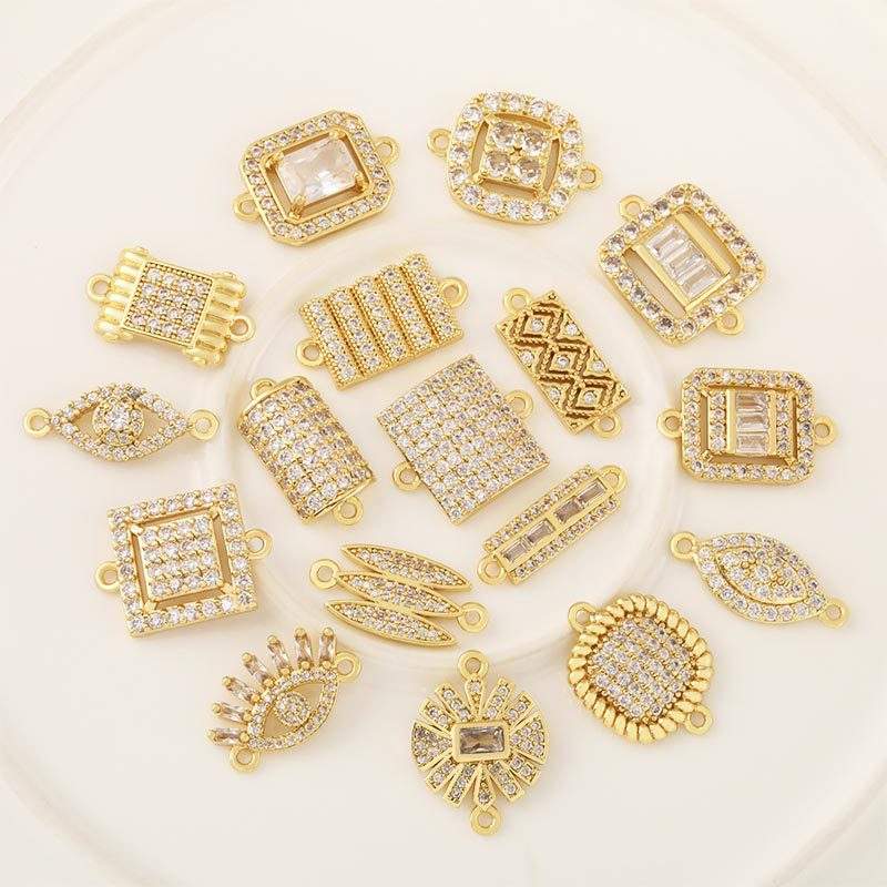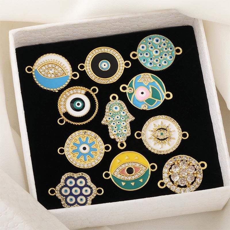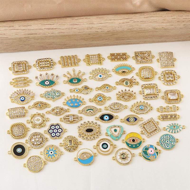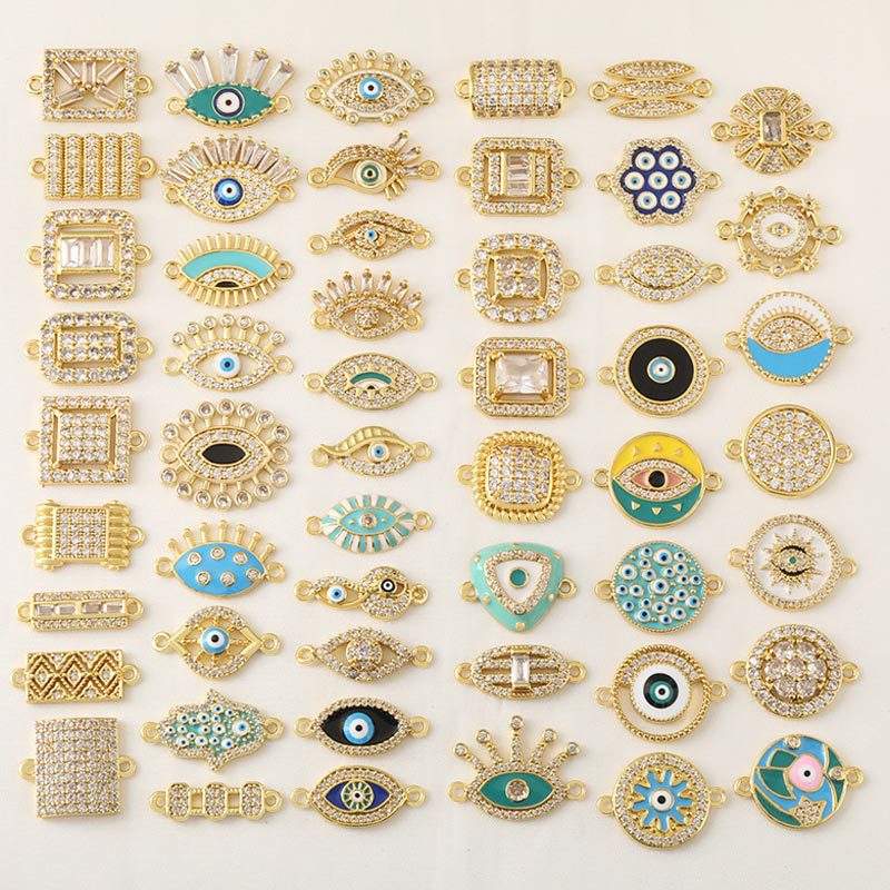 HP0200 Conector de Doble Orificio para Fabricación de Joyas, Dijes de Barra para Pulseras, de Latón Chapado en Oro de 18K, con Ojos Turcos y Esmalte de Zirconia, Venta al por Mayor