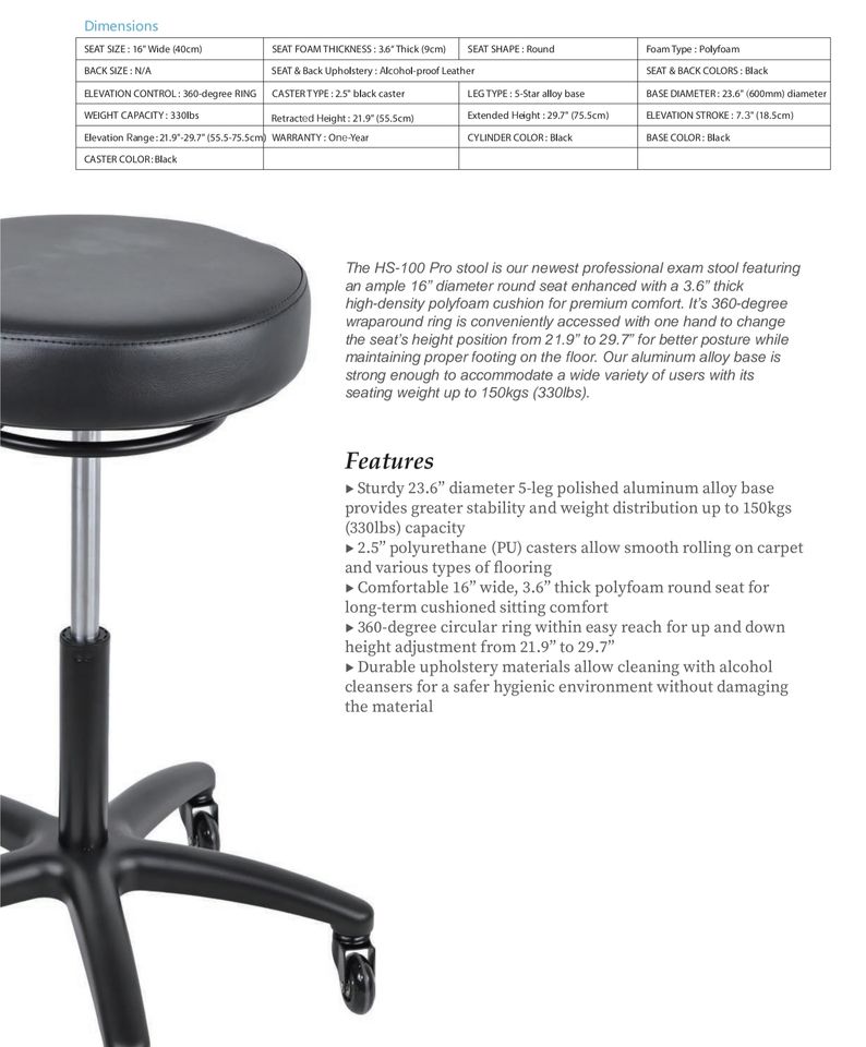 Taburete Redondo de Polifoam HS100 con Base de Aleación de 5 Estrellas, Ergonómico, para Médicos