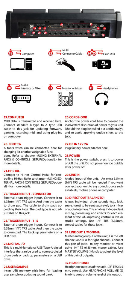 Configuración:9 pads integrados + 14 entradas de disparo