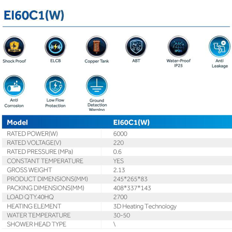 Nombre del Producto:Calentador de agua eléctrico instantáneo sin tanque portátil de 6kw para cocina bajo fregadero