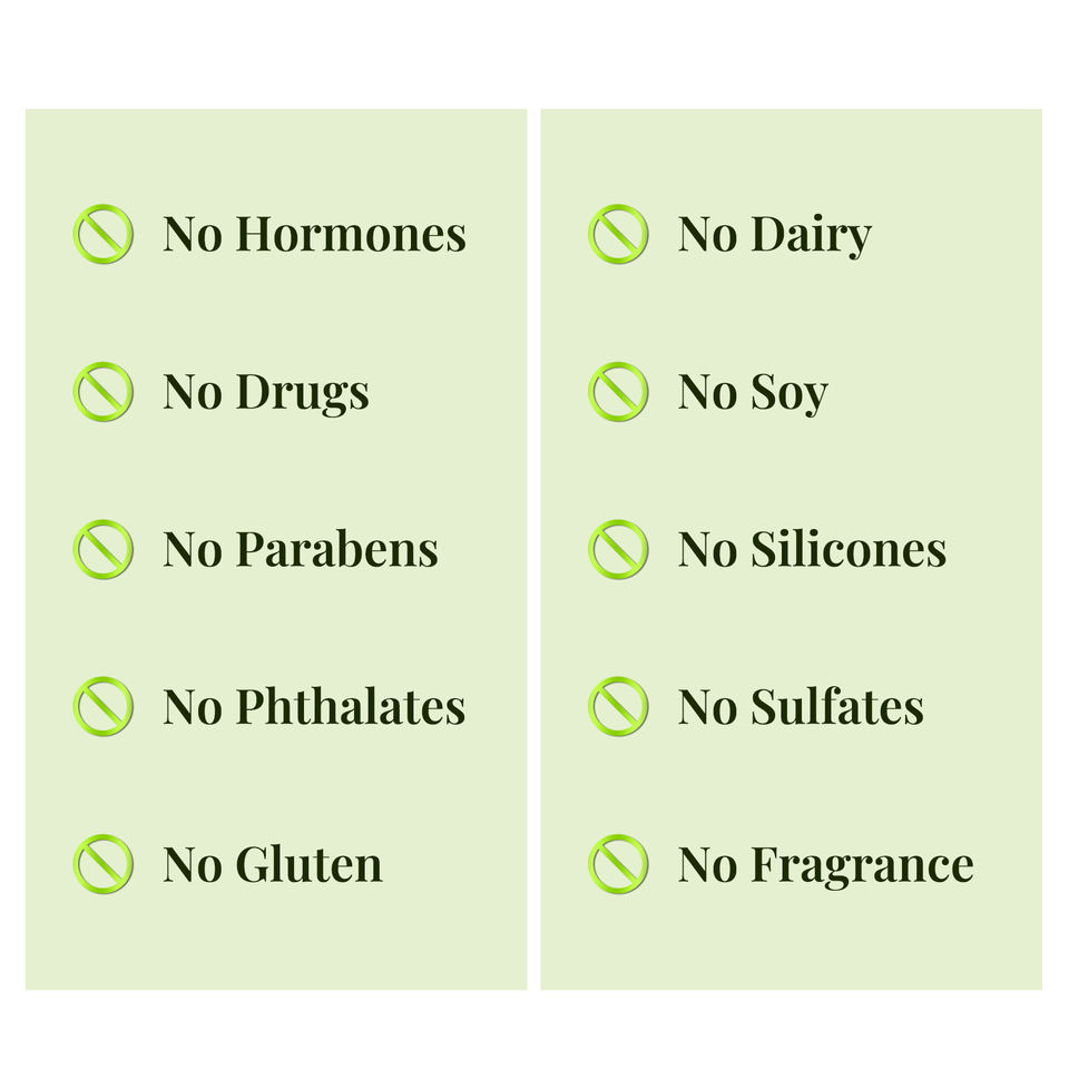 Aceite del árbol del té, Ácido Hialurónico, Argan oil, Herbario, Orgánico, Aceite de coco, El ácido salicílico, Aminoácido, Menta, Jengibre, Libre de silicona, Libre de crueldad, Vegano, Quertina, PersonalizadoIngrediente