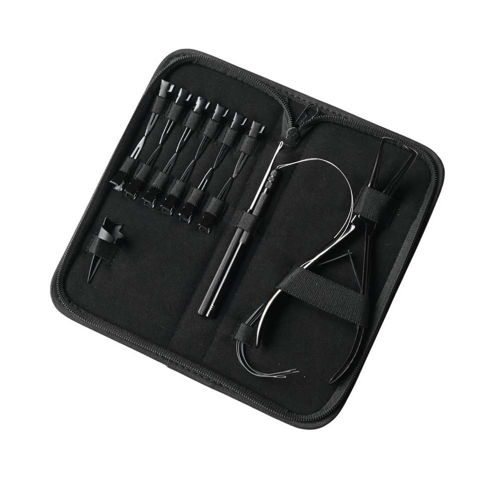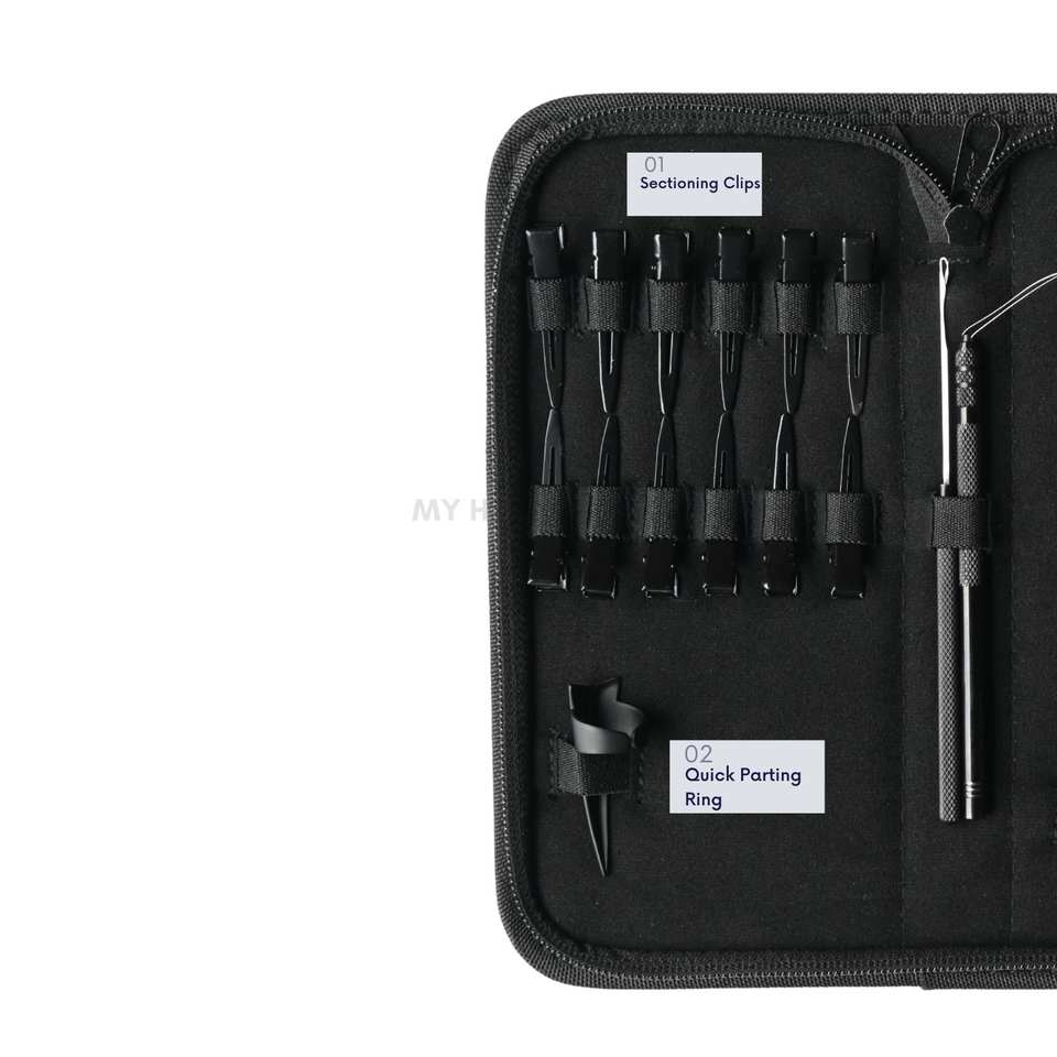 Kit de herramientas para extensiones de cabello con alicates removedores de microesferas y hilo tensor.