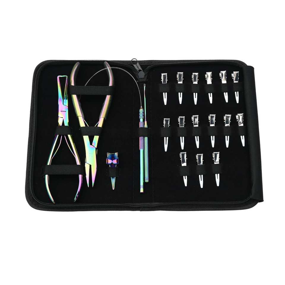 Cantidad mínima de pedido:1 estuche Kit de herramientas para extensiones de cabello Alicates de engarzado de microanillos coloridos