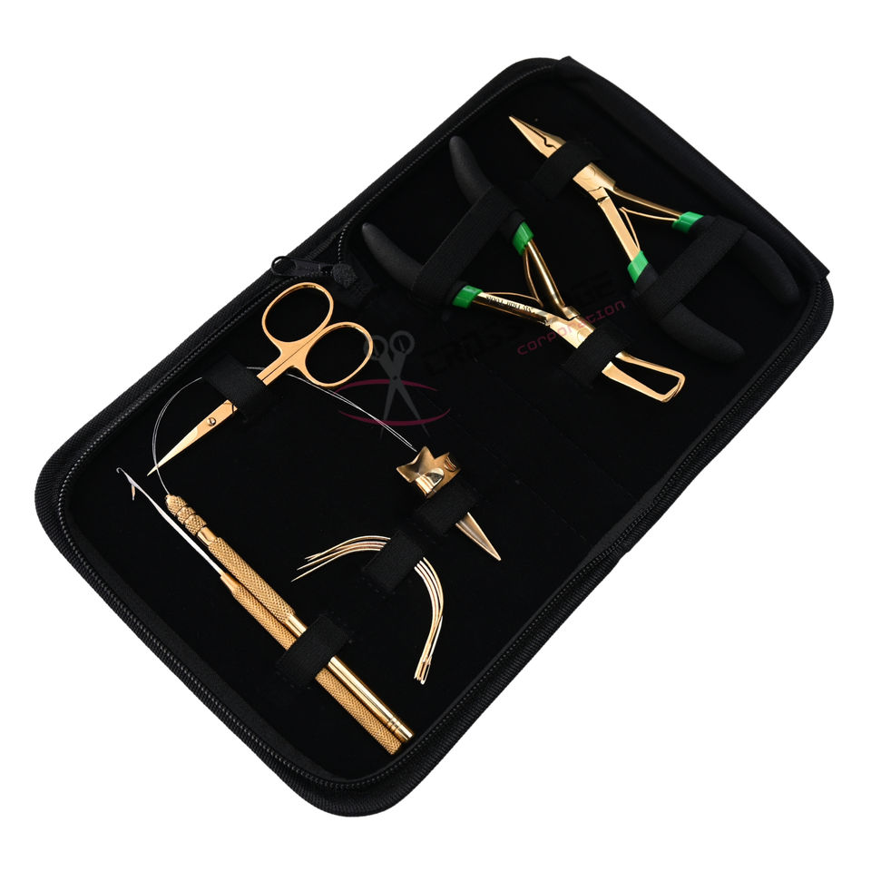 Kit de herramientas para extensiones de cabello con tenacilla de cuentas doradas y tijeras de precisión para hilo.