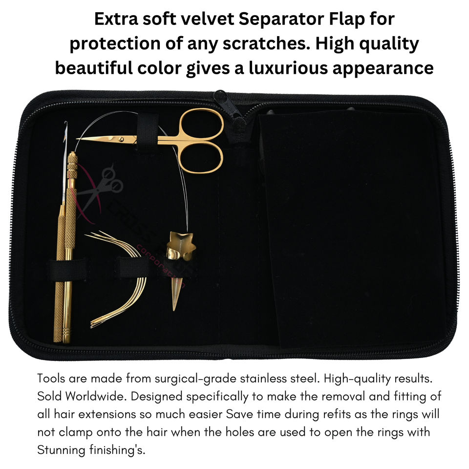 Kit de herramientas para extensiones de cabello con tenacilla de cuentas doradas y tijeras de precisión para hilo.
