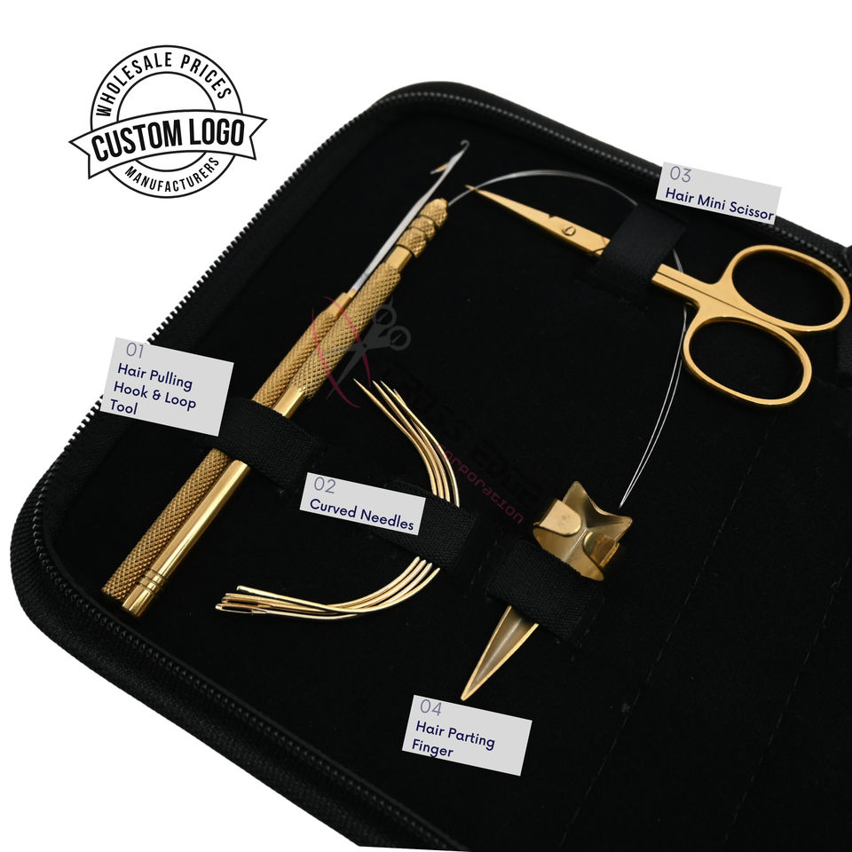Palabras clave:Kit de herramientas para extensiones de cabello con tenacilla de cuentas doradas y tijeras de precisión para hilo.