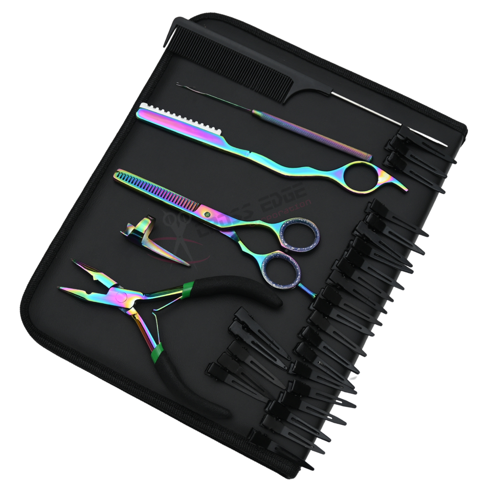 Kit de herramientas para extensiones de cabello con pinzas de acero inoxidable, tijeras de mezcla y cuchilla, y peine profesional de cola de rata con clips.