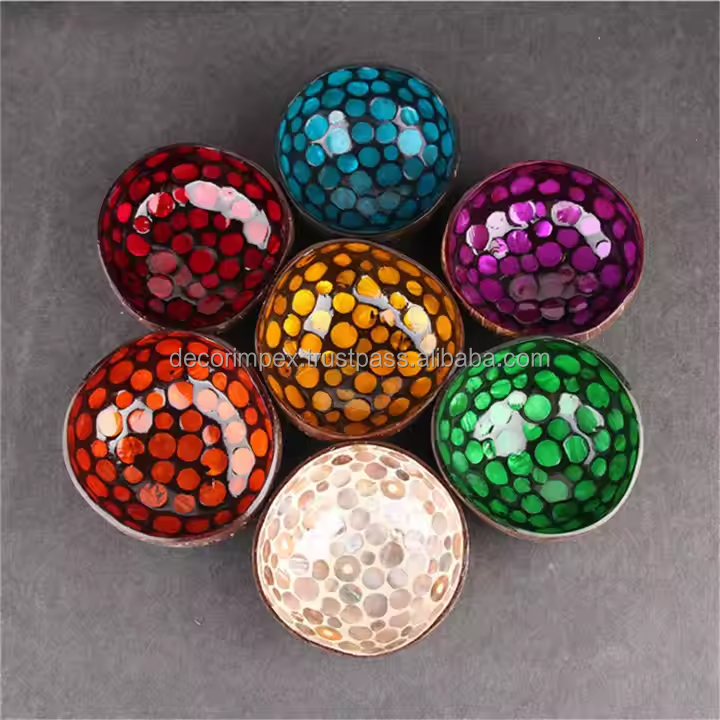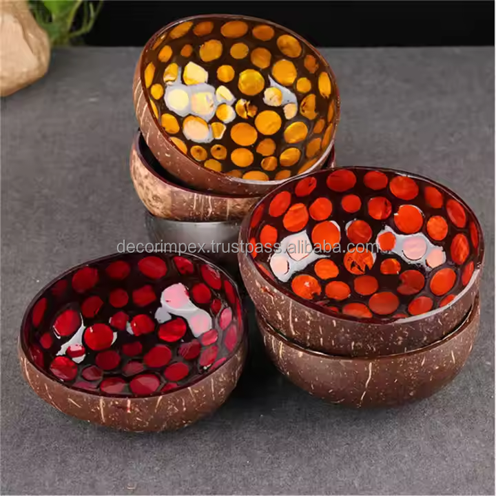 Tazón de media cáscara de coco para plantar, juego de cucharas de madera y ecológicas naturales, cuencos Vintage, pintura de laca vietnamita de Bali