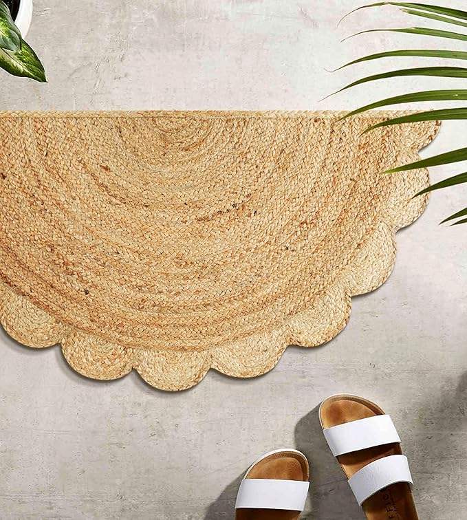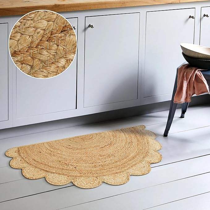 Alfombra Tejida a Mano con Borde Festoneado de Yute, Colección Decorativa Clásica de Calidad para Sala de Estar y Cocina - Natural