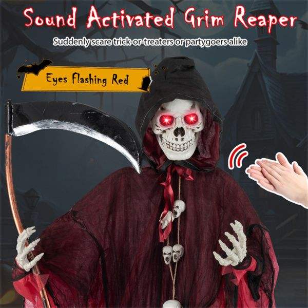 Esqueleto de Halloween de 8 pies, Ceñíbal con Ojos Rojos Brillantes y Sonidos Aterradoros, Brazos Ajustables, Decoración de Halloween, Detalles de Esqueleto/Hoz