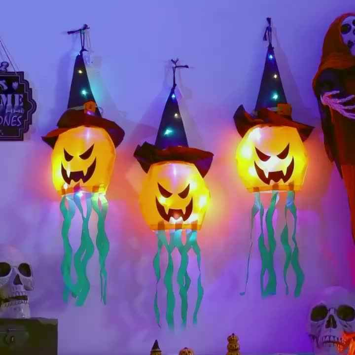 Lámpara decorativa LED de Halloween con forma de sombrero de bruja y calabaza, ambiente festivo, adecuada para fiestas y decoraciones de casas embrujadas