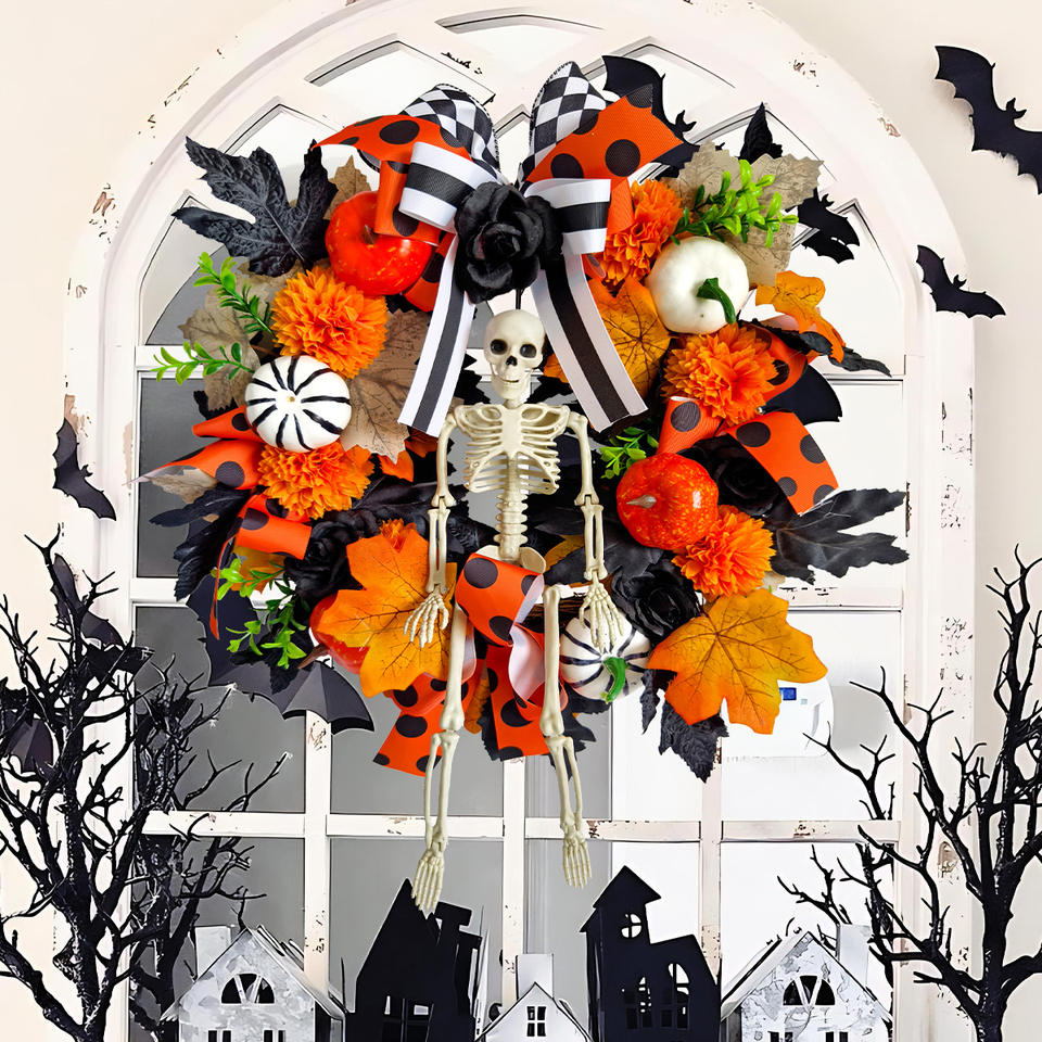 Corona de la hoja del esqueleto:Corona negra y naranja Corona de cementerio de Halloween