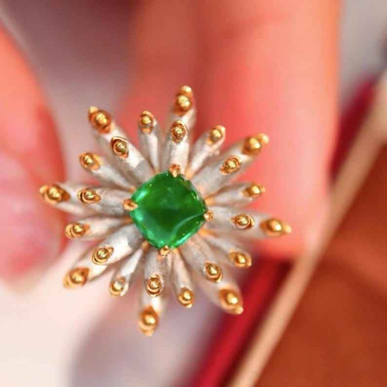Anillo de Esmeralda apilable de Halo, susurro esculpido, joya reflexiva radiante, pulido profundo, inspirado en la calma, forma de piedra verde, brillo Natural