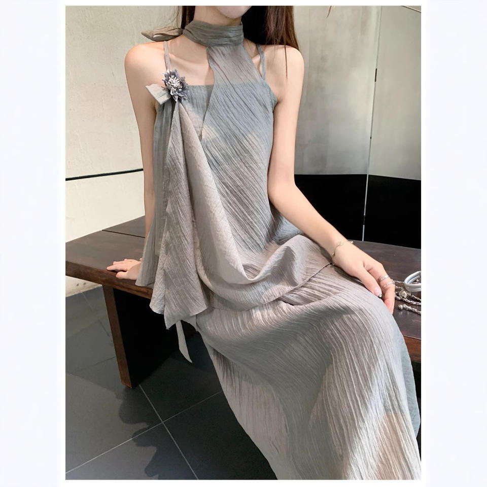 Vestido Largo de Gasa con Cuello Halter y Tirantes Finos, Estampado Geométrico Gris, Asimétrico, para Mujer, Estilo Casual