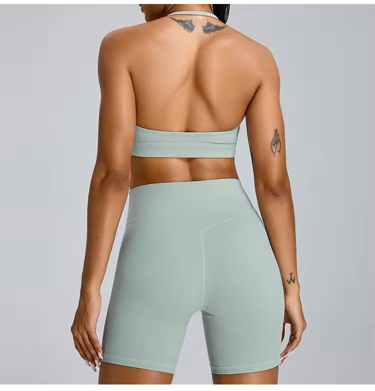 Conjunto de Yoga de 2 Piezas con Cuello Halter, Levanta Glúteos, para Gimnasio, Fitness, Espalda Descubierta, Sujetador Deportivo, Pantalones Cortos de Ciclismo de Cintura Alta, Transpirable, Spandex/Nailon