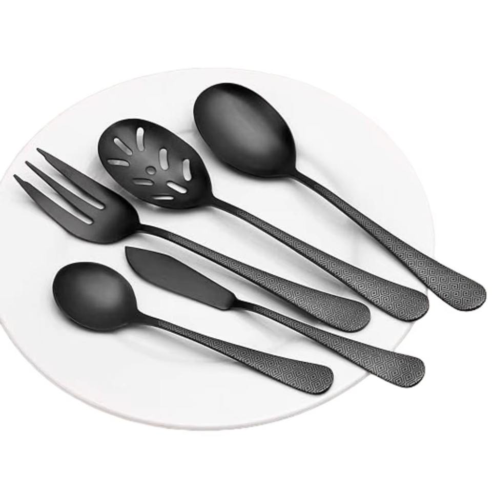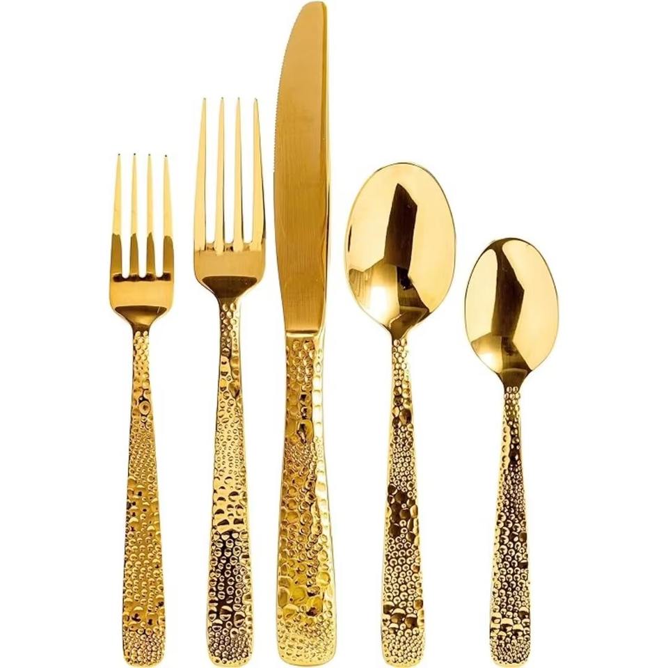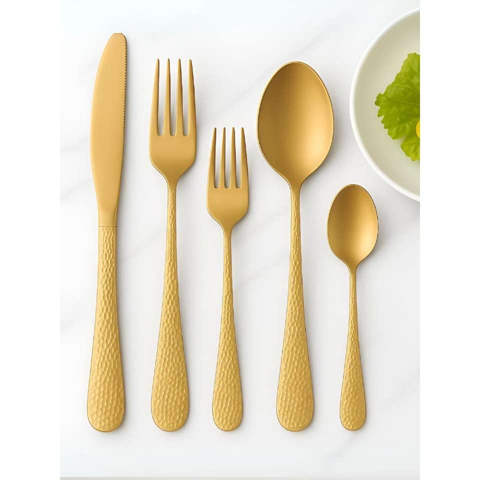 Mango de diseño martillado, cubiertos de acero inoxidable chapados en Color dorado, cubiertos aptos para lavavajillas para el hogar, restaurante, Hotel, uso, juego de 5