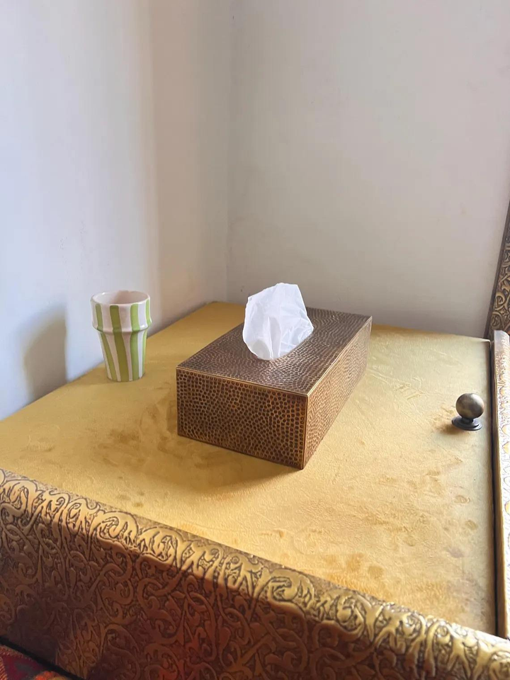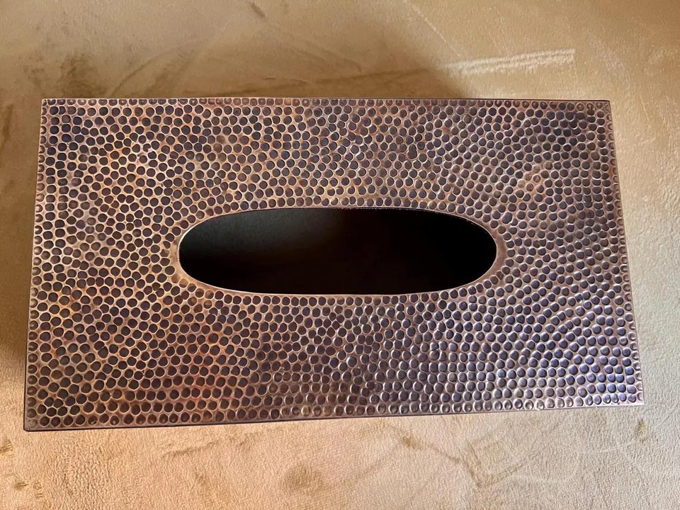 Caja de pañuelos metálica con diseño martillado, acabado dorado, perfecta para mesas de cocina, encimeras del hogar y mesas auxiliares, procedente de la India.