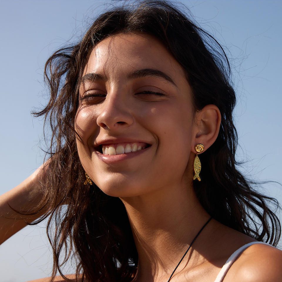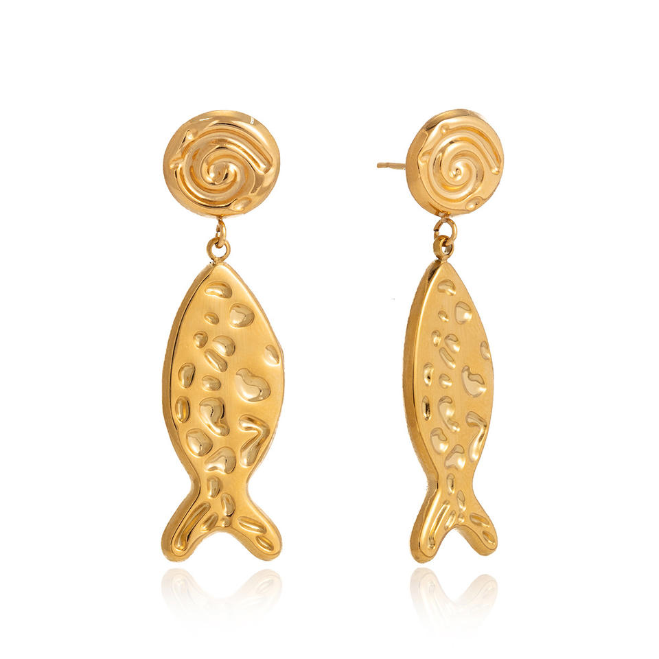 Pendientes de Acero de Titanio con Diseño de Pez Martillado, Color Dorado, Joyería de Moda con Forma de Animal