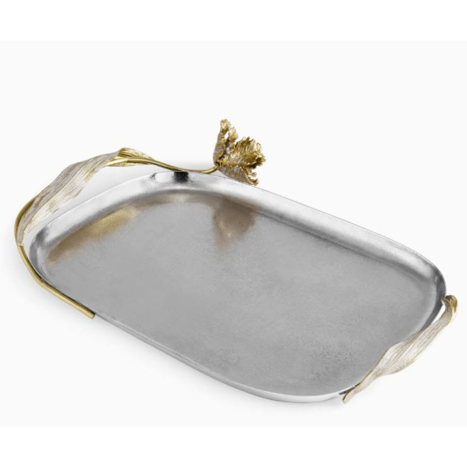Bandeja Rectangular de Acero Inoxidable Martillado con Asas de Hoja de Vid Doradas, Acabado Plateado y Dorado, Plato Decorativo para el Hogar