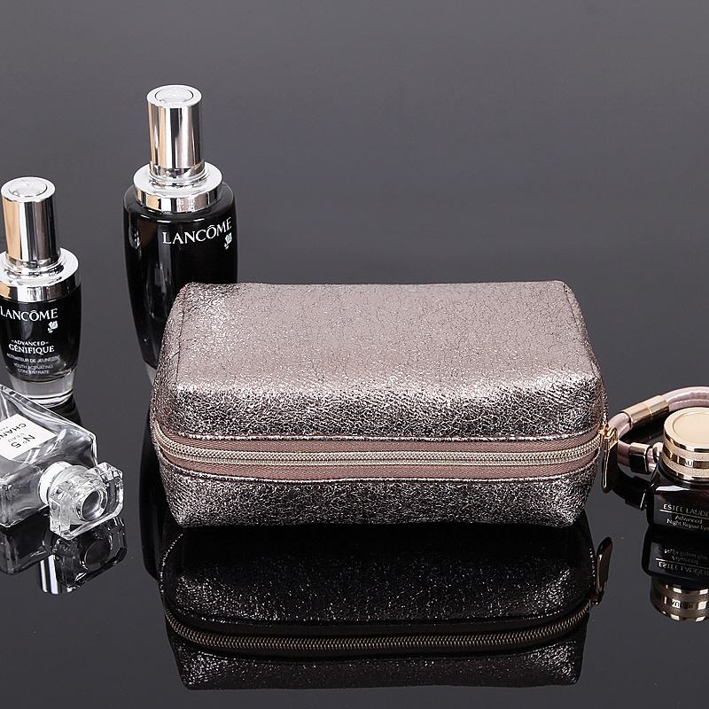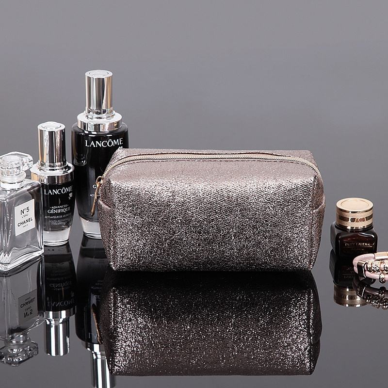 Bolsa de cosméticos de PU metálica martillada Bolsa de maquillaje con logotipo personalizado de cuero PU de 8 pulgadas con logotipo en relieve