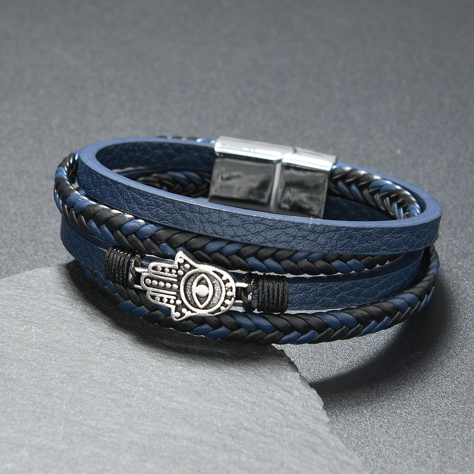 Pulsera de Cuero Multicapa con Amuleto de Mano de Hamsa, Cierre Magnético, Estilo Boho para Hombre