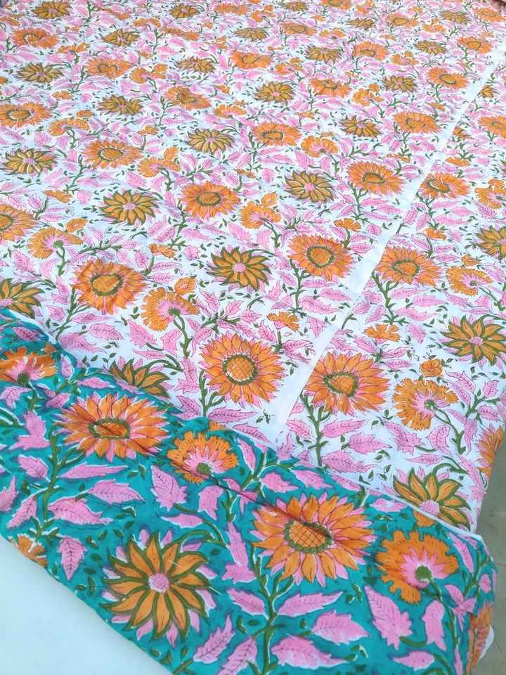 Colcha Jaipuri Reversible de Algodón Orgánico con Estampado Floral Hecho a Mano