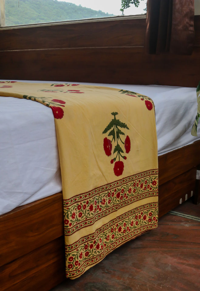 Sábana de Algodón Estampada a Mano | Sábana India con Motivo Floral de Cerezas y Borde | Ropa de Cama Hecha a Mano para Venta al por Mayor