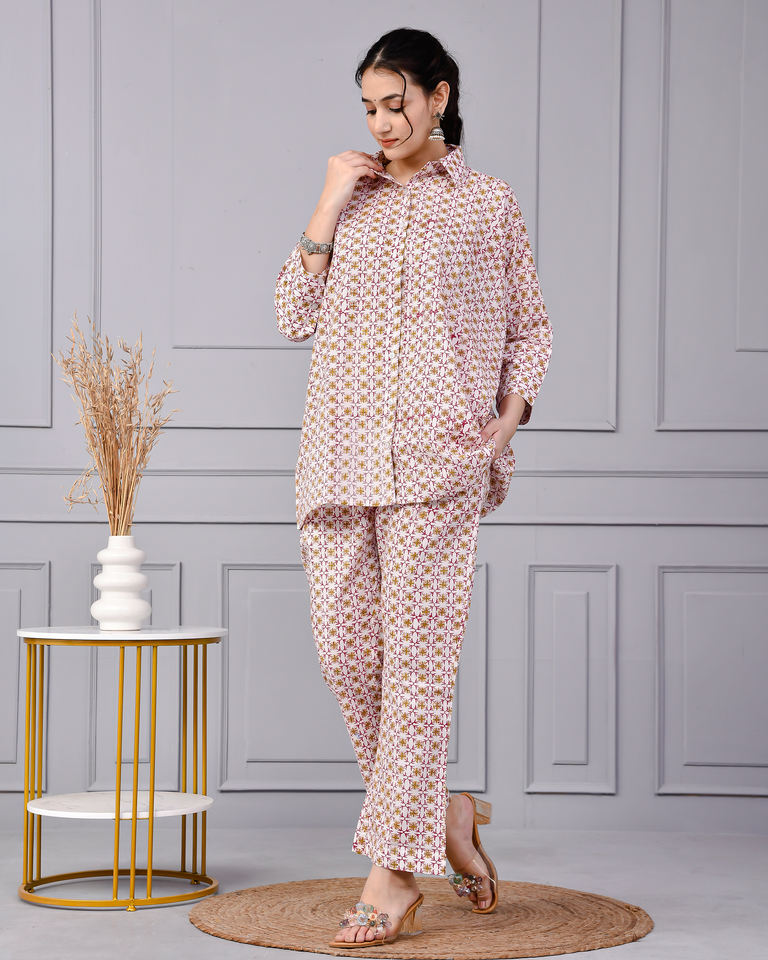 Conjunto de Algodón Estampado a Mano | Camisa Étnica con Estampado Floral y Pantalones Rectos | Ropa India Hecha a Mano